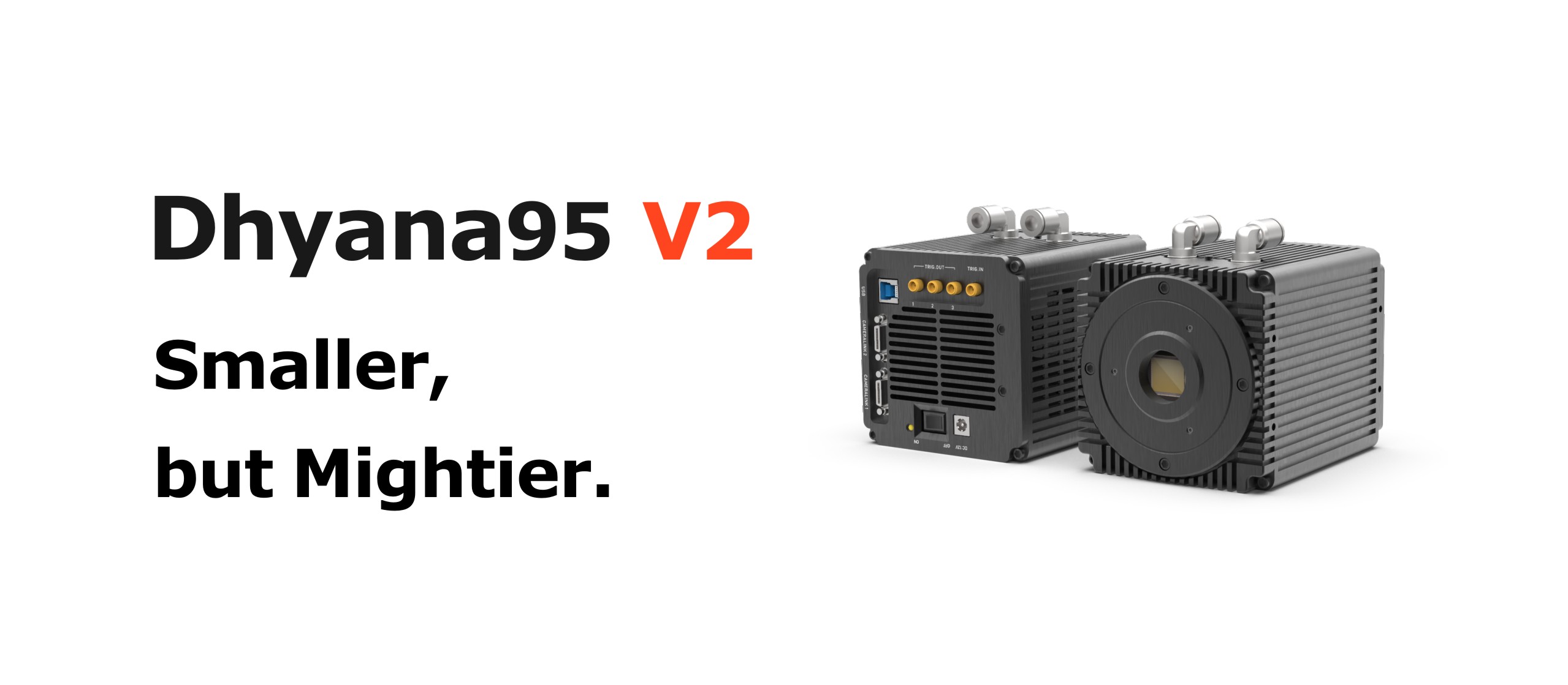 Dhyana 95V2 , not only with typical performances like 95% peak QE, 2” large area and 11um pixel size , but also mightier functions such as water-cooling, faster readout mode and superior background calibration.