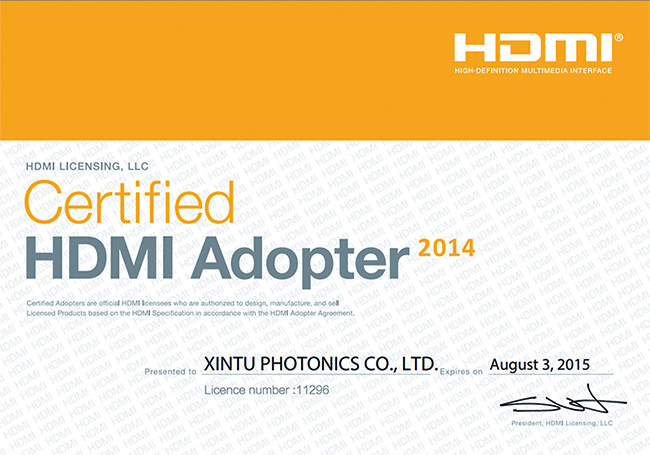 In August 2014, Xintu Photonics Co.,Ltd awarded the HDMI (High Definition Multimedia Interface) International Certificate of Authorization issued by HDMI associate.
