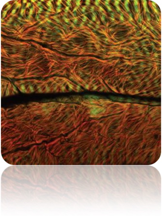 Muscle cells constitute a tough muscle tissue. Cross section of the tongue muscles of mice were shown in the image above, by the University of California, San Diego's Thomas deerinck (Thomas Deerinck) shooting. The following picture shows the hand of Hermann Aeberli (Aberle Hermann) of the University of Muenster, Germany, showing the enlarged muscle fibers of the fruit flies. Because of the genetic variation, the muscle fibers of the fruit fly look disorganized (confocal microscopy).