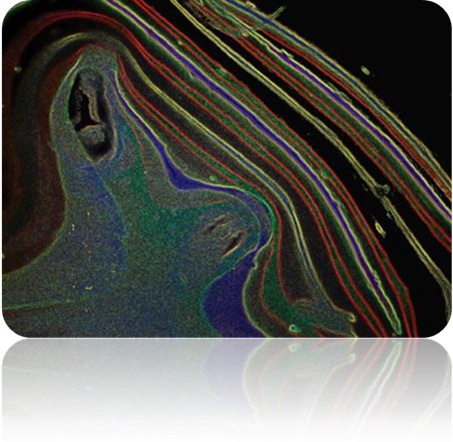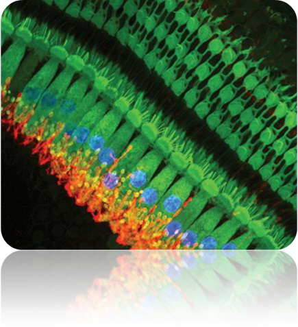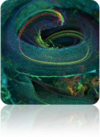Because the space is narrow and not easy to separate, inner ear structure is very difficult to observe. University of North Carolina Wilmington campus of Sonia Piot (Sonja pyott) captured the mouse inner ear hair cells (above left), these cells can be mechanical convert sound waves into electrical pulse signal. In the picture, the hair cells are green, and the cells of the hair cells are red and blue, then the nucleus (the confocal microscopy technique). Glenn MacDonald (MacDonald Glen), the University of Washington, uses a similar staining method to capture the tissue structure of the mouse inner ear (confocal microscopy).