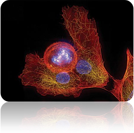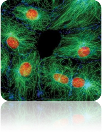 Here is Jan Schmoranza (Sch-moranzer Jan), the Columbia University, the cell membrane of the cells treated by serum starvation, and the structure of the microtubules (green). From the view of the graph, the microtubules of fibroblasts have shown abnormal behavior. The diameter of the microtubules is about 20nm, usually, when there is a gap in the cell membrane, the microtubules will aggregate at the breach, but the situation is not the case. In the interphase cell, Duke U - serdar, Tulu (U. serdar Tulu) in 138 mu m wide horizons captured the chromosome (blue) around is the formation of microtubules (yellow, below).