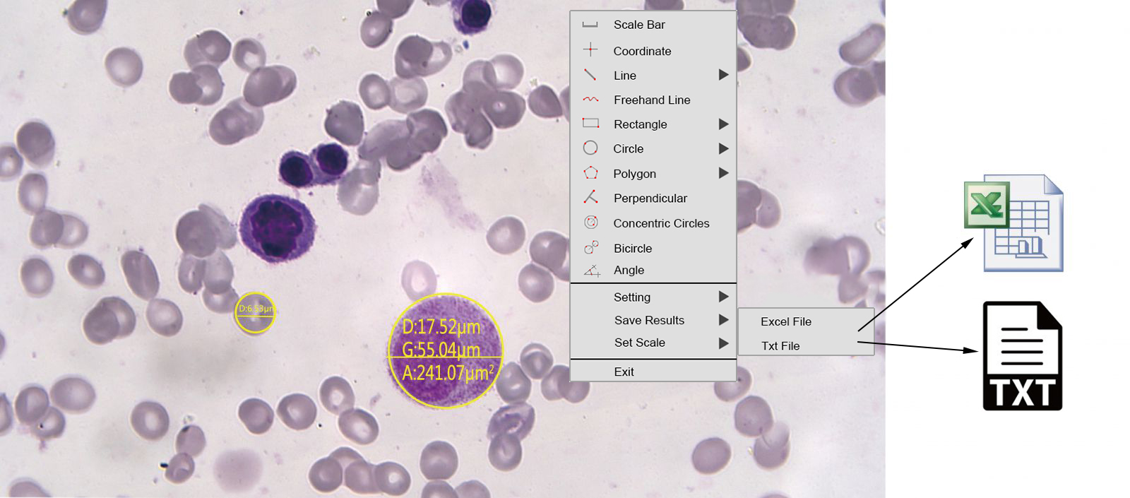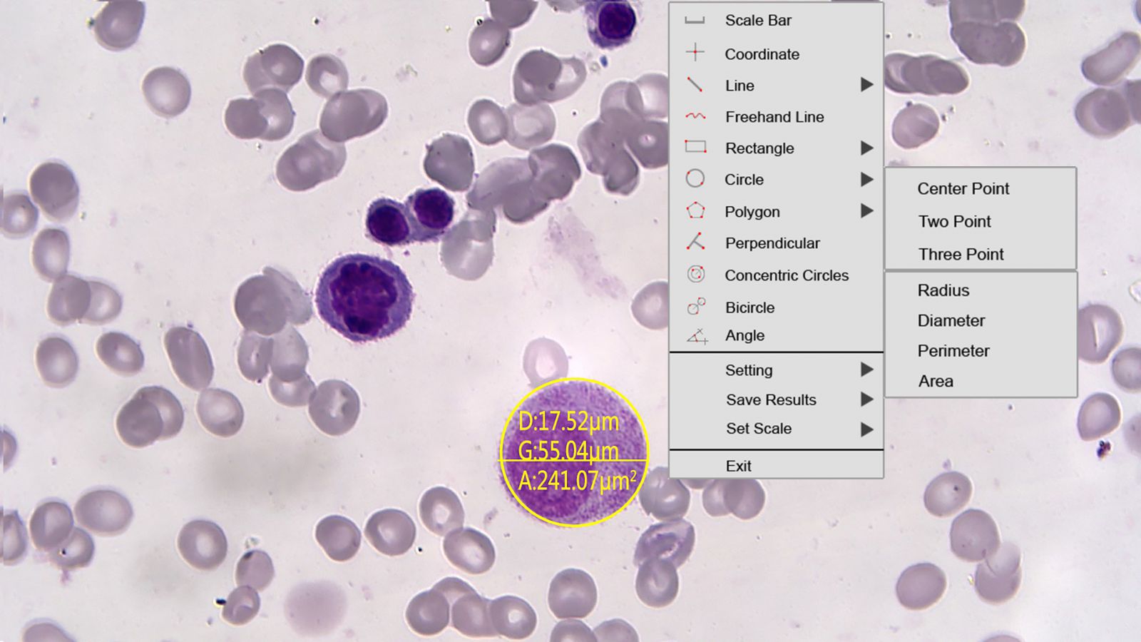 TrueChrome Metrics is equipped with a variety of measuring tools such as free line, rectangle, circle, polygon, dotted line, concentric circle, double circle, angle and so on. It can realize the precision of microns such as line distance, angle, length, circumference, area Measurement, the data can be accurate to 1/100 microns, very small cells can be measured very accurately.